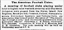 On January 6, 1886, representatives from several different athletic institutions across the New York metropolitan area met at 23 Dey Street in Manhattan to discuss the plausibility of a new athletic association for the sport of football. These institutions were the Staten Island, New-Brighton, Cutler, Stevens Institute, Polytechnic Institute, Brooklyn Hill, Crescent, and Victoria football clubs. The delegates of these eight athletic clubs eventually voted to form the association known as "The American Football Union". An election was held, and C. M. Smith of the Staten Island Cricket Club was chosen as the first AFU president. William Denman won secretary, and William H. Ford, E. P. Moorton, and R. M. Ormiston were appointed to the Executive Committee.[2][3]