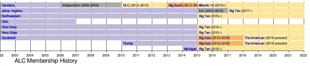 Schools that left the ALC before 2014 include Davidson College in Davidson, North Carolina and Ohio University in Athens, Ohio. Davidson later moved to the National Lacrosse Conference, still later became an associate member of the Big South Conference, and now houses its women's lacrosse team with most of its other sports in the Atlantic 10 Conference. Ohio University exited the ALC when the OU Athletics Department decided to drop several sports programs including women's lacrosse in January 2007.[9]