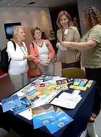 American Corners are areas within existing libraries or other institutions to provide information to the target populace located far from U.S. embassies.[68] At a start-up cost of US$35,000 the local U.S. embassy furnishes a space in a local library with several hundred books as well as six computers with internet access.[18] While the U.S. government provides the books and other materials, they are not staffed by Americans.[62] The concept proliferated across Eastern Europe and Central Asia in the early 21st century. In 2008, American Corners across Belarus (Babrujsk, Brest, Homel, Hrodna, Mahilyou, Malazhechna, Minsk, Pinsk, Polatsk and Vitsebsk) were closed without explanation.[69] As of February 2009, there were 414 such corners in existence.[18] A 2017 doctoral thesis posited a utilization analysis showing a cost-savings in American Corners, paired with a native institution and more-accessible to the general public than the spaces within heavily fortified embassies, indicating the former as more economical than the latter.[70] In 2002, then–Under Secretary of State for Public Diplomacy and Public Affairs Charlotte Beers proposed, in cooperation with the Smithsonian Institution, a program of "American Rooms" located within universities and other venues in the Middle East aimed at young adults to virtually display true American life as opposed to the fiction found on TV shows and movies.[71][72] In December 2016, one such room was opened at the University of Sarajevo providing students there an opportunity to observe U.S. public corruption trials.[73]
