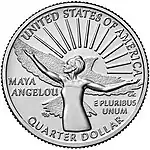• Maya Angelou, the first Black woman featured on U.S. currency.[19] Designed by Emily Damstra, who said her depiction of Angelou "convey[s] the passionate way she lived". She indicated that the bird in flight that silhouetted Angelou's arms was modeled on a Purple martin, which is native to Angelou's home state of Arkansas, and symbolized her autobiography I Know Why the Caged Bird Sings.[20] Oprah Winfrey called the design "a true treasure" and "an incredible moment" to commemorate her friend and poet's life.[21] Because a bust portrait was not permitted, Damstra chose to limit the details in the quarter, balancing negative space.[22]