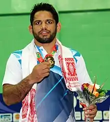 Amit Kumar Dhankar (born 2 January 1987) is a freestyle wrestler from India. He became Asian wrestling champion in 2013, along with becoming Commonwealth wrestling champion twice.[13][14][15] He also won gold medal in the 2016 South Asian Games.[16] In 2015, he participated in the inaugural edition of the Pro Wrestling League, where his team won the title.[17] He is employed as an inspector in the Haryana Police.[18]