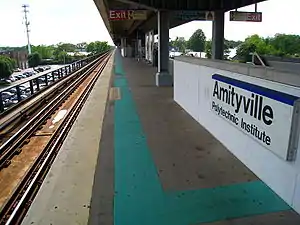 Amityville station is typical of the elevated Babylon Branch stations that were rebuilt during the mid-to-late 20th century. It was originally built in 1868 by the South Side Railroad of Long Island, then replaced by a brick station in 1889.[2] From 1890 to 1919, it was a stop for the Huntington Railroad cross-island trolley line, which included a bridge over the tracks on the west side of the station. It was also the terminus of the Amityville Line for of the Babylon Railroad trolley line from 1910 to 1920. When the trolleys were abandoned the cross-island trolley bridge over the tracks became a pedestrian crossover.[3] The station building was completely demolished in 1964 and on October 25, 1968, a temporary station building was opened with high-level side platforms to accommodate the new M1 cars and facilitate the construction of the new grade separated Babylon Branch. The new elevated structure was opened on August 7, 1973. The 1868 station remains standing as a private residence. Amityville is also the site of the first interlocking after the Central Branch splits from the Babylon Branch.
