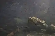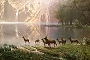 The painting depicts rugged mountains on the left and background that reach out to a bright sky with the Sun's rays peeking through the clouds. The mountains look over a calm lake with a group of deer and waterfowl on its edge and is bordered by trees on the right side of the painting.[7] On the viewer's left in the water under the shadow of the rocks, there is a single trout, only visible when viewed very closely.[8]
