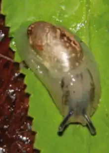This rare tropical land snail is endemic to the West Indian island of Dominica. The snail has been seen only very rarely since it was first discovered in the late 19th century, and it may eventually be listed as an endangered species. The shell of this snail is oblong and thin, but not fragile, and it has a large aperture.