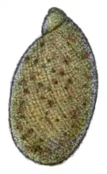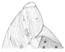 The shell is oblong, thin, but not elastic or fragile, corneous-olivaceous, with numerous irregularly scattered reddish dots. The surface is somewhat wrinkled with growth-striae and showing numerous very low but coarse irregular spirals. The shell has 2½ whorls. The apex is decidedly raised. The suture of the last half whorl is rapidly descending. The spire is rather slender and its length contained from 4½ to 4¾ times in that of the shell.[1]
