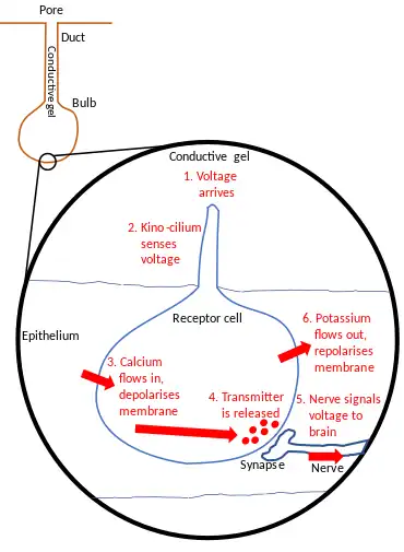 The ampullae detect electric fields in the water, or more precisely the potential difference between the voltage at the skin pore and the voltage at the base of the electroreceptor cells.[11][12][6]