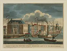 In September 1816 the British steamboat Defiance visited Amsterdam, but met little local enthusiasm.[2] The lack of support for steam navigation in Amsterdam is explained by that it threatened the vested interests of the Amsterdam merchants. There were however also genuine concerns about the net price for transport getting higher, and about the continuity of service. [3]