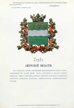 The Amur Oblast with the center in Blagoveshchensk was formed on December 20, 1858 by the Personal Decree No. 33862.[1] By this Decree, on the proposal of the Governor–General of Eastern Siberia and the Siberian Committee, the Amur Region was made up of lands "located on the left bank of the Amur River, starting from the junction of the Shilka and Argun Rivers or from the borders of the Trans–Baikal and Yakutsk Oblasts, along the entire course of the Amur, to the mouth of the river Ussuri and to the new border of the Primorsky Oblast".[2]