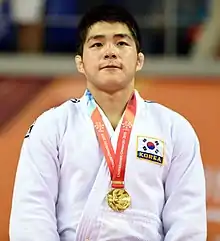 An defeated all his opponents by ippon at home ground in Gwangju. He defeated Yamamoto again in the semi-final, and took gold against Ukraine's Dmytro Kanivets.