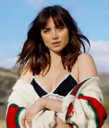 With encouragement from her newly hired Hollywood agent, she decided to move to Los Angeles.[14] When de Armas first arrived in Los Angeles in 2014,[32] she had to start her career again "from scratch."[16] She spoke very little English and, during early auditions, she often "didn't even know what [she] was saying."[7] She spent four months in full-time education to learn English,[33][29] not wanting to be confined to playing characters written specifically for Latina actresses.[9] She starred opposite Keanu Reeves in her first Hollywood release—Eli Roth's erotic thriller Knock Knock (2015)—and learned her lines phonetically.[34] Despite giving a positive review of the film, Randy Cordova of the Arizona Republic found de Armas to be "unconvincing" in her role.[35] Reeves then telephoned de Armas to invite her to star in a Spanish-language role in the thriller Daughter of God which he acted in and produced.[36] Producer Mark Downie hoped the film would be a star vehicle for de Armas, but due to executive meddling Daughter of God was severely edited with de Armas' former starring role reduced. The film was ultimately released as Exposed in 2016.[37][38] Frank Scheck of The Hollywood Reporter noted that while she was "appealing" in her part, de Armas was unable to demonstrate her "character's intense emotional demands."[39]