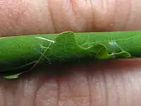 Larvae can be found from mid-April to June. The head and divided prothoracic plate are black and the body is greyish green with round black pinacula which are easily seen, while the anal plate is brownish. The larva rolls a leaf into a tube, held together with silken strands which can be seen on the edges of the roll. On creeping willow, due to their small size several leaves are spun around the central shoot, starting a short distance below the tip and working upwards.[3][4] Larvae of A. temerella also roll leaves around creeping willow.[5]