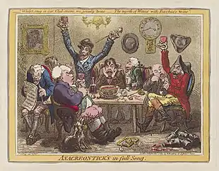 The Society came to an end after the Duchess of Devonshire attended one of its meetings. Because "some of the comic songs [were not] exactly calculated for the entertainment of ladies, the singers were restrained; which displeasing many of the members, they resigned one after another; and a general meeting being called, the society was dissolved."[3] It is not clear exactly when this incident occurred, but in October 1792 it was reported that "The Anacreontick Society meets no more; it has long been struggling with symptoms of internal decay".[4]
