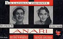 Anari is a 16 January 1959 Indian Hindi-language comedy film directed by Hrishikesh Mukherjee. The film stars Raj Kapoor, Nutan, Motilal and Lalita Pawar. The music was by Shankar Jaikishan and the lyrics by Hasrat Jaipuri and Shailendra. This was among the few movies in which Lalita Pawar played a positive role and Motilal a role with shades of grey. The film was remade in Tamil as Pasamum Nesamum[1] and in Turkish as Derbeder, Acı Türkü, Enayi and Başa Geler Çekilin.
