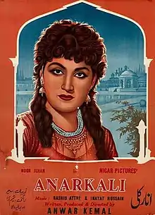 Anarkali is a 1958 Pakistani historical drama film, directed by Anwar Kamal Pasha and starring Noor Jehan and Sudhir in lead roles. Based on the Urdu play of the same name by Imtiaz Ali Taj, the screenplay is written by Qamar Ajnalvi. The film revolves around the love of Jahangir for a slave girl Anarkali which creates a serious conflict between Prince Jahangir and his father, Mughal emperor Akbar. The film was released on 4 June 1958 and its performance was 'average' at the Box Office.