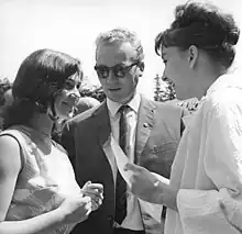 In 1962 Vertinskaya starred in the Amphibian Man, Gennady Kazansky and Vladimir Chebotarev's adaptation of Alexander Belyayev's science fiction novel of the same title. Cast as Gutierrez, a young woman in love with an amphibian man, Vertinskaya had to go through difficult late autumn underwater shooting sessions which she performed all by herself, without any stuntwomen involved.[9] The film became the Soviet 1962 box-office blockbuster. "Vertinskaya was now a brand. People were going to the cinema to watch her, specifically," her future husband Nikita Mikhalkov later recalled.[9] All this changed the teenage actress's life dramatically. "In those days there weren't any bodyguards. I used to travel by tram to my studies. I had to queue for bread like everyone else. Not only was I recognized, they made a point of touching me too... It was in those days that I developed the fear of crowds... This immense psychic violence haunted me all through those years," she later remembered.[10]