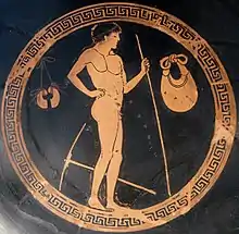 Gymnasium scene: athlete holding a javelin; next to him, a mattock to soften the soil of the jumping pit; jumping weights and a sponge bag hang on the wall. Attic red-figure cup, c. 490 BC