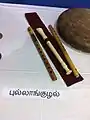 List of Musical instruments used by ancient Tamil people was listed in Tirumurai[3] dated between 6th and 11th century CE and include Akuli, Idakkai, Ilayam, Udukkai, Yezhil, Kathirikkai, Kandai, Karathalam, Kallalaku, Kalavadam, Kavil, Kazhal, Kalam, Kinai, Kinkini, Kilai, Kinnaram, Kudamuzha, Kuzhal, Kaiyalaku, Kokkarai, Kodukotti, Kottu, Kombu, Sangu, Sachari, Sanchalam, Salari, Siranthai, Silambu, Sinam, Thagunicham, Thakai, Thadari, Thattazhi, Thathalagam, Thandu, Thannumai, Thamarugam, Thaarai, Thaalam, Thuthiri, Thunthubi, Thudi, Thuriyam, Thimilai, Thondagam, Naral Surisangu, Padagam, Padutham, Panilam, Pambai, Palliyam, Parandai, Parai, Paani, Paandil, Pidavam, Perigai, Mathalam, Mani, Maruvam, Murasu, Muravam, Murugiyam, Murudu, Muzhavu, Monthai, Yaazl, Vangiyam, Vattanai, Vayir, Veenai, Veelai, and Venkural.