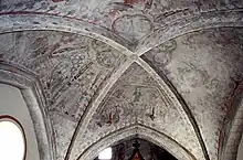In the apse vault, Christ in a mandorla can be seen judging the world surrounded by the sun, moon and stars. In the chancel, Christ is seen rising at the Ascension with images of Mary and the Apostles. The nave vaulting presents fragments of the Annunciation and the Nativity, the shepherds, the Adoration of the Magi and Mary with the infant Jesus. There are also images of the Last Judgment with Christ sitting on a rainbow.[1]