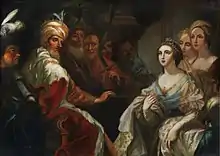In 1689 he decorated a room in the palazzo Delay.[3] In 1696 in Treviso, Celesti painted a Final Judgment and the Death of Simon Magus. In the Castle of San Giusto in Trieste, a large ceiling painting with the Allegory of Venice is attributed to him. In other works, he painted altarpieces at Lonato (1690–93 and Desenzano. By 1700 Celesti was back in Venice, where he set up his studio. He painted frescoes for Villa Rinaldi Barbini (1705–07).[4] For the Basilica di San Lorenzo in Verolanuova, Celesti Painted a Birth of the Virgin and an Assumption (c. 1707).