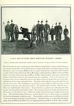 The battery was assigned to the Artillery Brigade of VI Corps in May 1863. In that arrangement it served in the Battle of Gettysburg. In reserve at first, on July 3, 1863, it was placed just south of the copse of trees on Cemetery Ridge, in time to resist Pickett's Charge. Cowan's guns filled a gap in the infantry line left when a regiment left the front. Cowan ordered his men to fire "double canister" on a group of Confederates trying to penetrate the federal line, and their fire broke up that threat. BG Henry J. Hunt, the army's chief of artillery, was present with them and had his horse shot out from under him.[7] A newspaper account reported that Capt Cowan served in a gun crew at the height of the assault.[8] A monument to the battery, executed by J. G. Hamilton, stands on the site of this action.[9]