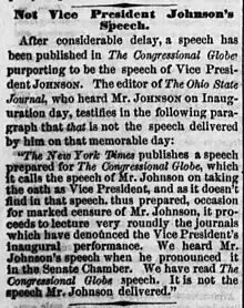 There appears to be no surviving verbatim transcript of the entire speech.[48] Multiple accounts had it that the Congressional Globe reporters were "tampered with" in order to prevent the release of an accurate transcript.[55][44] Volume seven of The Papers of Andrew Johnson (published in 16 volumes by the University of Tennessee) offers two variant reports of the speech, a "sanitized" version from the Congressional Globe,[56] and one from the New York Times,[57] as well as a mention of a flattering rendition from the Philadelphia Press that "totally concealed the humiliating episode" while simultaneously revealing that the audience in the chamber responded with silence rather than applause when Johnson concluded his remarks.[58] The Cleveland Daily Leader called out the "double dealing" New York Times for reprinting the "expurgated and glossed over" wording in the Globe, writing, "It is notorious that the speech published in the Congressional Globe is not the speech which Mr. Johnson delivered. It is notorious that the real speech disgraced the speaker and insulted the audience, and covered the nation with shame. It is notorious that when that speech was delivered Mr. Johnson was in a state of gross intoxication."[59] According to the Andrew Johnson Biographical Companion, news reports of the content of the speech tended to itemize the topics as bullet points and/or claim that Johnson could not be heard due to ambient noise.[60] The Baltimore Sun passed the buck, referring its readers to "the Senate's proceedings" should they care to know the content of the speech.[61] The Raleigh (N.C.) Weekly Progress claimed that perhaps reporters found the speech incomprehensible because of "the want of order which prevailed among the women in the galleries."[62]