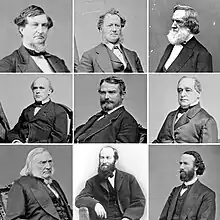 Bottom, L to R: Justice Samuel Nelson, journalist Noah Brooks, U.S. Senator John B. Henderson (Missouri)
