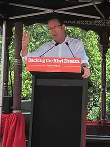 As Leader of the Labour Party and Leader of the Opposition, Little sought to challenge the Government with a strong alternative narrative. In a 2015 conference speech he introduced a new "Kiwi dream" theme (the New Zealand dream).[28] In 2015 Labour introduced a new slogan, "Backing the Kiwi Dream".[29] Little largely focused on issues and concerns such as rising house prices in urban areas, a 'brain drain', unemployment and job security and the growing wage gap between baby boomers and millennials—the "Kiwi dream" narrative was particularly designed to engage young voters.[30]