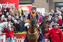 Andrew Lynch is a retired Irish National Hunt jockey. Lynch had his first ride in a bumper at Fairyhouse in April 2001 and his first winning ride in May 2002 on Tristernagh in a novice hurdle at Downpatrick.[1] Lynch won 2 races in the Cheltenham Festival in 2010 and 2011. His 2 Cheltenham Festival wins in 2010 were on Sizing Europe and Berties Dream in the Arkle Challenge Trophy and Albert Bartlett Novices' Hurdle and respectively while his 2011 wins were on Sizing Europe and Sizing Australia in the Queen Mother Champion Chase and Cross Country Chase respectively.[2] In May 2012 Lynch broke his leg after a fall at Cork.[3]