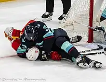 Andrew Mangiapane fighting with Will Borgen of the Seattle Kraken.