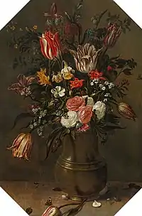 Andries Daniels' flower pieces are close to those of the Antwerp painter Ambrosius Bosschaert the Elder to whom they have been attributed frequently. The composition, colour and lighting, however, call to mind the work of Jan Brueghel the Elder, the brother of Daniels' master Pieter Brueghel the Younger who was also famous for his flower still lifes.[5] Although often a symbolic meaning has been attributed to the flower paintings, such as the vanitas meaning of the transience of worldly things, the principal aim of the artist in these works is to create a convincing illusionistic effect.[4]