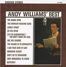 Andy Williams' Best is a compilation album by American pop singer Andy Williams that was released late in 1961 by Cadence Records.[3] This second album to compile the singer's material features 10 songs that made the Billboard Hot 100 along with two of their corresponding B-sides.