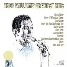 Andy Williams' Greatest Hits is a compilation album by American pop singer Andy Williams that was released in early 1970 by Columbia Records.[5] It was not, however, as its title might suggest, strictly a hit singles compilation, although some of his biggest songs since joining Columbia (such as the easy listening number ones "Can't Get Used to Losing You" and "Happy Heart") were included. A couple of selections ("Born Free" and "More") were never released as singles by Williams, and his signature song, "Moon River", was released in the 7-inch single format but only for jukeboxes.[6] His six Cadence singles that made the Top 10 on Billboard magazine's Hot 100 are passed over for the inclusion of his number 11 hit from that label, "The Hawaiian Wedding Song", and 17 of his Columbia recordings that made the Hot 100 up until 1970 are left out here in favor of "Charade", which spent its one week on the chart at number 100.[7]