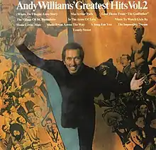 Andy Williams' Greatest Hits Vol. 2 is a compilation album by American pop singer Andy Williams that was released in June 1973 by Columbia Records.[4] This collection follows in the footsteps of its predecessor, Andy Williams' Greatest Hits, in that it is not limited to his biggest and most recent hit singles, although his final two US Top 40 entries ("(Where Do I Begin) Love Story" and "Speak Softly Love (Love Theme from 'The Godfather')") were included.[5] It also has an album track not released as a single ("The Impossible Dream (The Quest)"), a couple of hits from his time with Cadence Records ("Lonely Street" and "The Village of St. Bernadette"), two other singles that could have been included on the first volume ("In the Arms of Love" and "Music to Watch Girls By"), and two Easy Listening chart entries that never made the Billboard Hot 100 ("Home Lovin' Man" and "Music from Across the Way").[5][6]