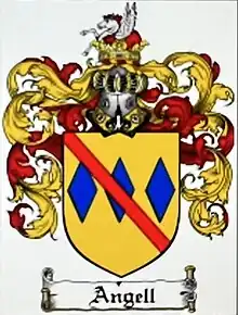 The name in both England and the USA derives from "DeAngeli", an Italian name from Trento in the Lombardy region. Roger DeAngeli came over to England in 1485 to fight as a mercenary for Henry Tudor at Bosworth. His son Robert changed his name to the Anglicised "Angell" when Henry VIII broke with Rome, to lose the Roman Catholic connection. The family rose to prominence with key posts in local and national affairs throughout the next 200 years, notably Sir Thomas John Angell in the mid 1500s. The family seat was at Peakirk in Northamptonshire, although many family members ended up in Chippenham in Wiltshire and also Cambridgeshire later. John Angell (Chippenham) died in 1702 and bequeathed land for St. John's church, St. John's school and local housing in Brixton. The church and school are still there, the current Bishop of Croydon Dr. Rosemarie Mallett [1] was the vicar at the church previously. The residential area is now the notorious "Angell Town" Estate, featured in David Cohen's article in the London Evening Standard some years ago.[2]