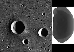Left image shows Angelou crater at left. At right is a broadband image of the interior, shadowed part of Angelou.