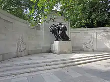 Plans for a Belgian war memorial in London were proposed by a group of Belgians in 1916, to be funded by public subscription. The memorial was designed by Sir Reginald Blomfield. Its main feature is a central bronze sculpture by Belgian sculptor Victor Rousseau, who himself spent time as a refugee in London during the war. The sculpture was cast by A.B. Burton at the Thames Ditton Foundry. It depicts a Belgian woman, accompanied by a boy and a girl carrying garlands of flowers. The bronze stands on a stone plinth which bears the inscription, "To the British nation from the grateful people of Belgium, 1914–1918".