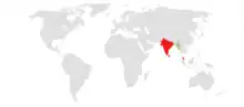 Distribution of Anisomeles malabarica. Native distribution in red, introduced in green.