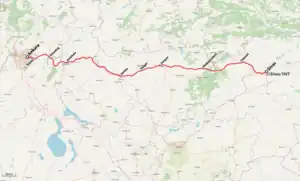 The Ankara–Sivas high-speed railway (Turkish: Ankara–Sivas yüksek hızlı demiryolu), is a 406 km (252 mi) long high-speed railway in Turkey and is the second longest high-speed railway in the country after the Ankara–Istanbul high-speed railway. Travel time between Ankara and Sivas was reduced to 2 hours and 50 minutes,[2] from around 9 hours and 30 minutes with conventional trains.[3][4] The railway will also serve as an extension of the Ankara-Istanbul HSR with a total journey time from Istanbul to Sivas at around 7 hours. The line was opened on April 26, 2023.[5]