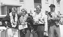 ![]() Ann Pellegreno at Oakland Airport upon the return of the world flight on July 7, 1967. L to R: William Polhemus (navigator), Ann Pellegreno, Leo Koepke (aircraft owner and mechanic) and William Payne (copilot) | |