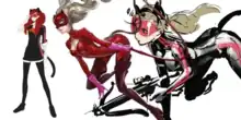 Ann Takamaki was created for Persona 5 by Shigenori Soejima who uses the Phantom Thief nickname Panther to hide her identity.[1] Director Katsura Hashino discussed how she has a foreign air to her that gets attention, but also makes her unapproachable.[2]Ann's Phantom Thief alter ego was always intended to be feline-like. Her Phantom Thief outfit consists of a skin-tight red latex catsuit with a cleavage cutout and zippers, a matching red panther mask, pink gloves, and a clip-on tail on the back of her catsuit. For her footwear, she wears dark red thigh-high boots. Unlike the current red catsuit with a matching cat mask, she was originally going to have a black dress, goggles, a tail, and thigh-high socks. Her next design was more similar to her final design, still featuring goggles and wearing a black catsuit. She lacked a cleavage window in her catsuit and wielded a crossbow instead of a whip.[1] Ann initially gains the Persona Carmen, which eventually transforms into Hecate. The designers noted that the male characters' Personas were comparatively well-known versus female characters' Personas. They felt that if all of them were based on famous gods it would be lacking in depth, so some were made obscure, including Hecate. They still made a point of ensuring that Hecate was a good fit with Ann's personality, however.[3]