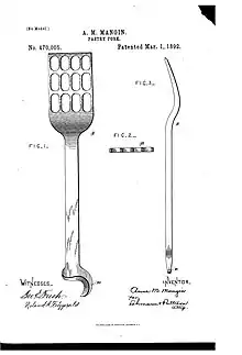 To hear Andrew Mangin tell it, his wife first came up with the concept of a simplified manner of making pastry by an improvement to the pastry fork, and "then and there described it to him. The description was so clear and minute that Mr. Mangin often says, when speaking of the incident, 'I saw that fork just as plain as I see you now.' " Andrew Mangin went out to his tool shed and whittled a prototype of the fork out of yellow pine. Once Anna approved the model, Andrew had a more substantive model of the fork made, first from iron, and then from white metal. Anna Mangin received the patent for the pastry fork on March 1, 1892.[17]