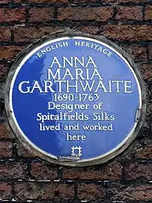 A Blue Plaque granted by English Heritage in 1998 marks the house at 2 Princelet Street, Spitalfields, E1, where Garthwaite lived and worked.[20]