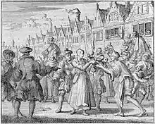 Anna Jansz on the way to her execution, supposedly giving away her child, etching by Jan Luiken from the Martyrs Mirror, 1685