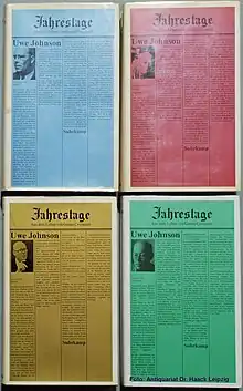 Anniversaries: From a Year in the Life of Gesine Cresspahl (German: Jahrestage. Aus dem Leben von Gesine Cresspahl) is a tetralogy of novels by Uwe Johnson begun in 1970, with further volumes published in 1971, 1973, and finally in 1983.[1] The main character, Gesine Cresspahl, is a German single mother in Manhattan, and we follow her life from childhood in 1930s rural Eastern Germany at the time of the rise of Nazism, through World War II, the Soviet occupation zone, the establishment of the GDR, and beginning of the Cold War, followed by her exile to New York. Eventually, she decides to return to Europe, and leaves for Prague, unaware that Soviet tanks have occupied the city and put down the Prague Spring.[2][3] The novel has 367 short sections, one for each day of the year, from 21 August 1967 to 21 August 1968 (a leap year) plus a prelude section in the first volume and an appendix to the second, though it bears very little resemblance to a series of diary entries. The narrative moves between past and present, and often shifts rapidly from first- to third-person. Most sections incorporate news reports, as Gesine reads them in the New York Times each day on the subway.