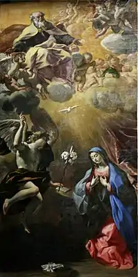 The Annunciation is an oil-on-canvas painting by the Italian Baroque painter Giovanni Lanfranco. It is the main altarpiece of the first chapel on the right in the church of San Carlo ai Catinari in Rome, Italy.