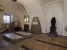 In 1720 a crypt was excavated under the church to provide 21 burial spaces. The first interment was that of Tsarina Praskovia Saltykova, the wife of Tsar Ivan V, on 24 October 1723.[2] On Peter's orders the remains of his sister, Natalya Alexeyevna, and his infant son Peter Petrovich, who had originally been buried in the monastery's Lazarevsky Church, were transferred to the burial vault.[2] The lower church was consecrated on 25 March 1725. Several other members of the imperial family were later buried in the church, including those who had lost their positions through palace coups. Among them were Anna Leopoldovna, mother of Tsar Ivan VI and regent during her son's brief reign; and Emperor Peter III who was deposed and killed in a palace coup that brought his wife to the throne as Empress Catherine II.[2] Peter III was quietly interred in the church in July 1762, thus denying him burial in the traditional resting place of the post-Peter the Great rulers, the Saints Peter and Paul Cathedral. Peter III's remains were later removed from the church and reburied in the Saints Peter and Paul Cathedral on the orders of his son when he ascended to the throne as Paul I.[2] Other members of the imperial family buried in the church include Catherine Ivanovna, Peter the Great's niece; Natalia Alexeievna, Paul I's first wife; and several children who died in infancy, including two daughters of Emperor Alexander I and Elizabeth Alexeievna; Olga Pavlovna, daughter of Emperor Paul I and Maria Feodorovna.[1][5]