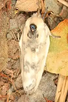 The wingspan is 21–30 mm. Adults resemble a bird-dropping.