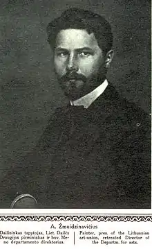 During World War I, Žmuidzinavičius worked as a teacher at the newly established Lithuanian courses for teachers and Lithuanian gymnasium.[4] In 1917, he worked at Lietuvos aidas and helped organize Vilnius Conference (designed tickets, decorated the meeting hall, etc.).[9] When Soviets captured Vilnius at the start of the Lithuanian–Soviet War in December 1918, Žmuidzinavičius established a commission that sought to collect and safeguard artworks in the city.[1] In 1919–1921 and 1924–1966, he lived and worked in Kaunas.[4] He recruited men to the Lithuanian Army during the Lithuanian War of Independence and was a founding member of the Lithuanian Riflemen's Union. He participated in Lithuanian defence against Poland during the Żeligowski's Mutiny and was captured near Babriškis but managed to escape after three days.[2] He continued to care after the works of Mikalojus Konstantinas Čiurlionis and worked to organize a museum to house them.[4] In February 1921, together with Juozas Tumas-Vaižgantas he was tasked with the establishment of the Vytautas the Great War Museum.[2]