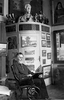 He also created posters and book illustrations.[4] His works are kept by various museums, including the Lithuanian National Museum of Art, Institute of Lithuanian Literature and Folklore, Vytautas the Great War Museum, Tretyakov Gallery in Moscow,[12] and Moscow State University.[4] catalogs of his exhibitions were published in 1956, 1957, and 1963. Albums of his artwork were published in 1966 and 1977 (paintings) as well as in 1987 (bookplates).[4] His paintings are regularly sold at art auctions. His most expensive painting Dzūkų kaimelis (Village of Dzūkai) was sold for 53,000 euros at Vilnius Auction in 2013.[16] It is a well-known painting that is frequently added to various albums of Lithuanian art and was originally acquired by Pranas Mašiotas in 1910.[17]