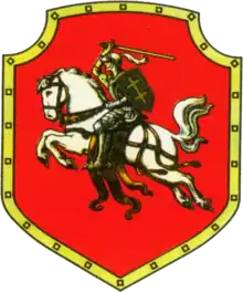 Žmuidzinavičius participated in the creation of the modern Flag of Lithuania. He prepared green-red flag which decorated the halls during the Vilnius Conference in 1917.[18] However, the delegates found such flag too dark and gloomy and Tadas Daugirdas proposed adding a yellow strip. The Council of Lithuania created a special three-member (Žmuidzinavičius, Daugirdas, and Jonas Basanavičius) commission to come up with the final flag design which was submitted on 19 April 1918. The proposed tricolor yellow-green-red was adopted and is in use today.[18] Žmuidzinavičius also created a version of the coat of arms of Lithuania which was popular in interwar Lithuania (no design was chosen as the official version by the government). His version was based on the work of Tadeusz Dmochowski and depicted the knight diagonally giving the impression that it is flying.[19] Žmuidzinavičius disregarded traditional colors and chose dark-toned shadows. Žmuidzinavičius also created some symbolic paintings with the rider from the coat of arms.[19]
